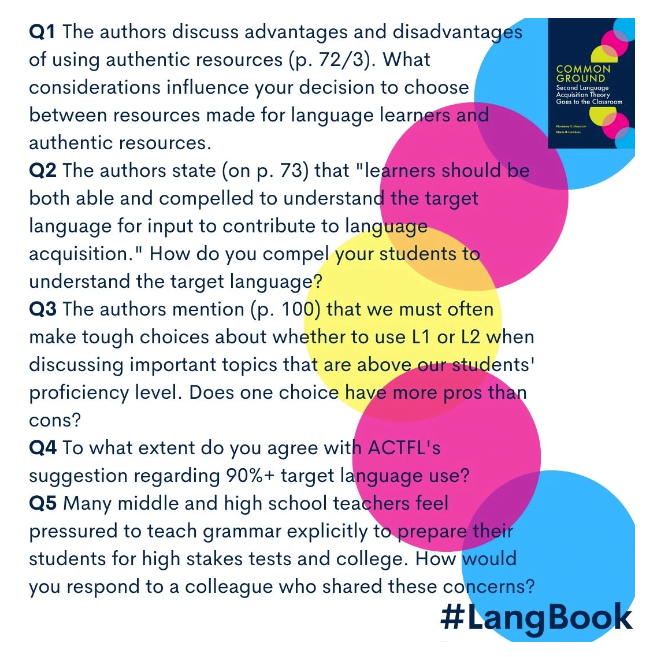 Welcome back to another #LangBook blog post where I write my thoughts about the book Common Ground: Second Language Acquisition goes to the Classroom by Florencia Henshaw and Maris Hawkins. I couldn’t tweet live this week due to parent-teacher conferences but I didn’t want to miss out on this opportunity for reflection and discussion. This week, the facilitator was Lisa Shepard from Columbus, Ohio! I feel slightly strange that this wonderful individual lives 20 minutes from me and we have never met. This must change. This weeks #LangBook was all about Input/Compelling Input and reviewed chapter 3 of the book. Here are the questions that she created (or co-created?) for the week.